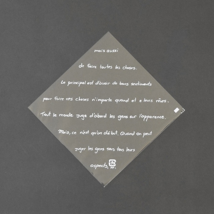 背面が白いクラフト紙、前面が透明フィルムで、中身が映えるガゼット袋です。フィルムは曇りにくい防曇フィルムを採用、フランス語のデザインをあしらい、中身を見せつつ高級感を演出します。背面はフィルム貼り加工が施されているため、油ものにもお使いいただけます。●入数:100枚