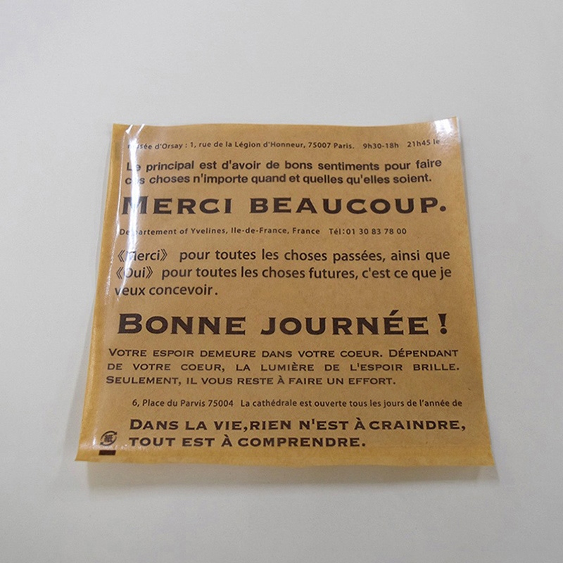 背面がクラフトカラーに着色されたOPPバーガー袋です。前面は透明フィルムにフランス語のデザインをあしらい、中身を見せつつ高級感を演出します。●入数:100枚
