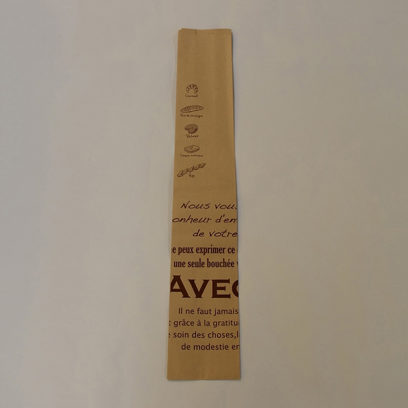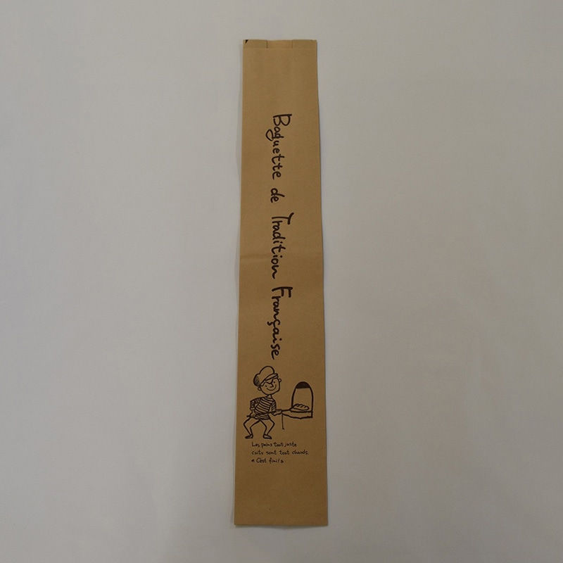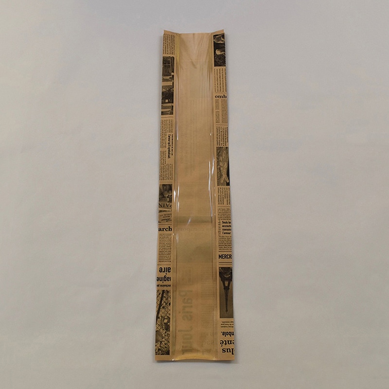 正面に透明フィルムが貼ってあり、中身がしっかり見える窓付きフランスパン袋です。バゲットのクープもよく見えます。フランス語の新聞をイメージしたデザイン。サイドガゼットタイプ。フィルムは曇りにくい防曇フィルムを採用。●入数:50枚