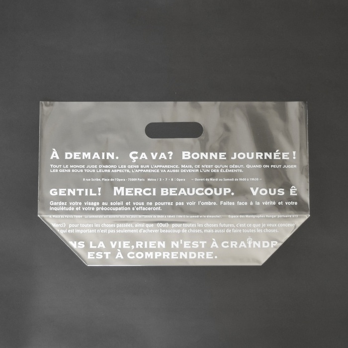 フランス語のデザインをあしらった、テイクアウト用の手提げOPP袋です。底マチがあるスタンドタイプなので、詰め合わせなどに使用すれば商品が見栄えします。●入数:100枚