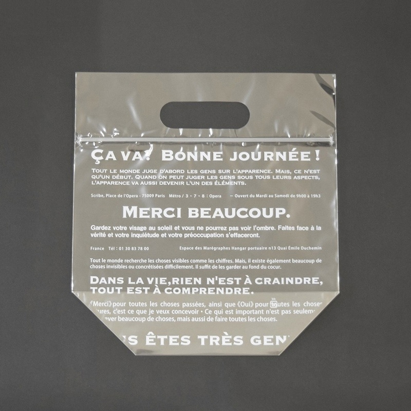 フランス語のデザインをあしらった、テイクアウト用の手提げOPP袋です。お持ち帰り後もパンの保存がしやすいジップ付きタイプ。底マチがあるスタンドタイプなので、詰め合わせなどに使用すれば商品が見栄えします。●入数:100枚