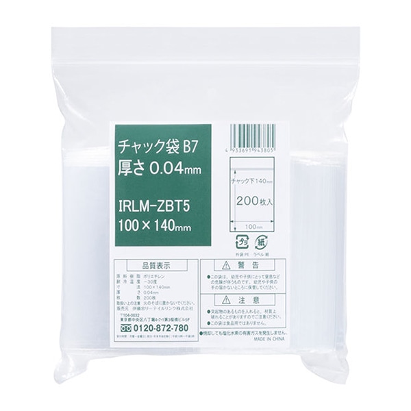 伊藤忠リーテイルリンク ポリ袋 チャック袋 B7 0.04mm 200枚入 IRLM-ZBT5 1パック(ご注文単位40パック)【直送品】