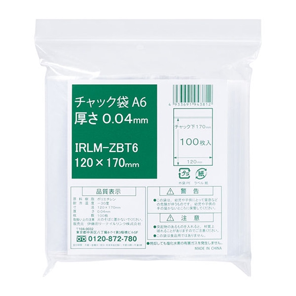 伊藤忠リーテイルリンク ポリ袋 チャック袋 A6 0.04mm 100枚入 IRLM-ZBT6 1パック(ご注文単位60パック)【直送品】