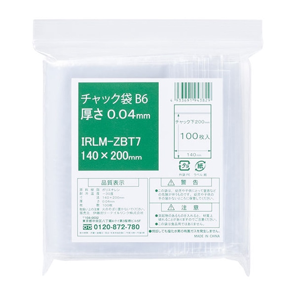 伊藤忠リーテイルリンク ポリ袋 チャック袋 B6 0.04mm 100枚入 IRLM-ZBT7 1パック(ご注文単位50パック)【直送品】