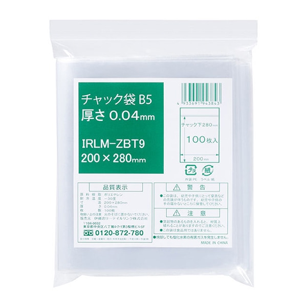 伊藤忠リーテイルリンク ポリ袋 チャック袋 B5 0.04mm 100枚入 IRLM-ZBT9 1パック(ご注文単位25パック)【直送品】