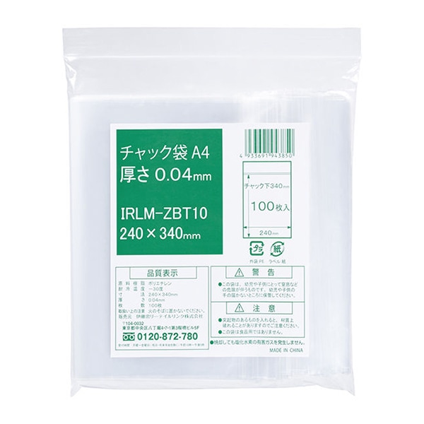 伊藤忠リーテイルリンク ポリ袋 チャック袋 A4 0.04mm 100枚入 IRLM-ZBT10 1パック(ご注文単位15パック)【直送品】