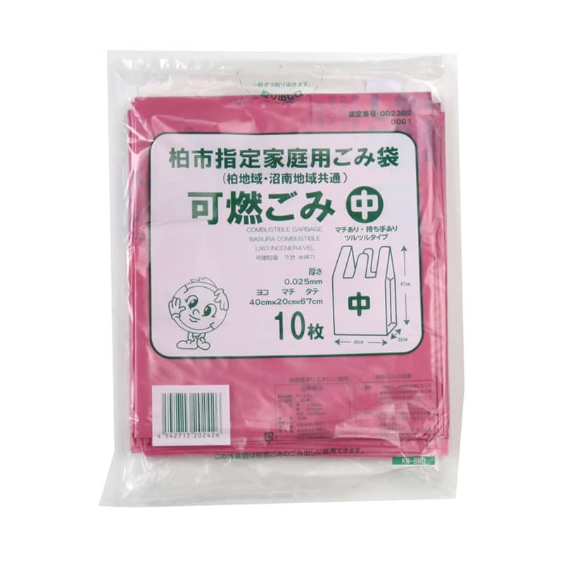 柏市指定、家庭用ごみ袋です。燃ごみ用ピンク色、中サイズ。柏地域・沼南地域共通。パッケージの外装袋は有害ごみのごみ出しに使用できます。口を結びやすいレジ袋タイプ。●入数:10枚