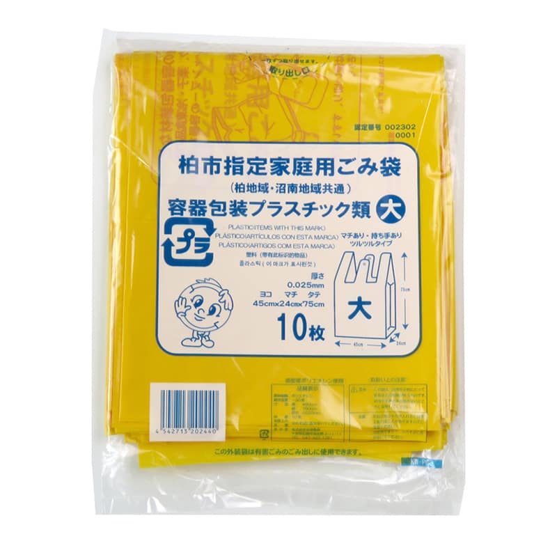柏市指定、家庭用ごみ袋です。容器包装プラスチック用黄色、大サイズ。柏地域・沼南地域共通。パッケージの外装袋は有害ごみのごみ出しに使用できます。口を結びやすいレジ袋タイプ。●入数:10枚