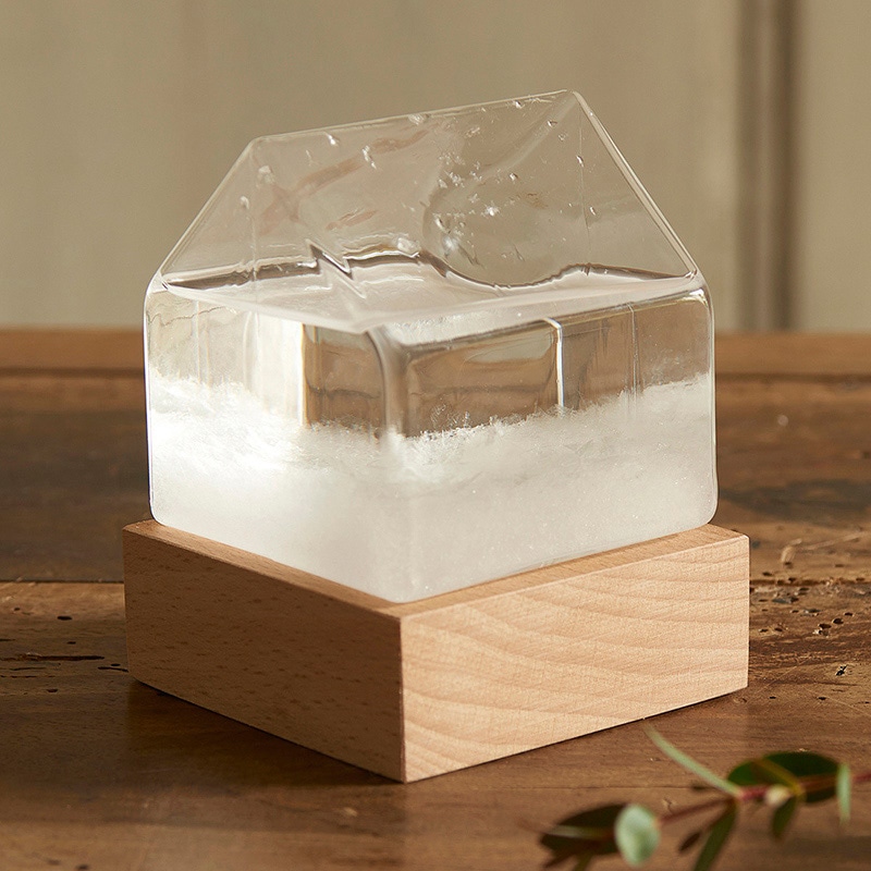 北欧テイストの家をモチーフにしたストームグラスです。ガラスと天然木のナチュラルな組み合わせがほっこりのオブジェ。寒い季節には液体内に結晶が沢山現れ、お部屋が暖められれば透明に。可愛いデザインの自然派オブジェです。ストームグラスは複数の化学薬品をアルコールに溶かしガラス容器に詰めたもので、天気や気温などによって液体内の結晶の様子が変化すると言われており、結晶がユニークに変化する様子を楽しむことができます。春・秋・冬にまるで生きているように表情を変える結晶を楽しめます。※差し込み式セットアップ。※正確な気象状況を予測するためにはお使いできません。観賞用のオーナメントとしてお楽しみ下さい。