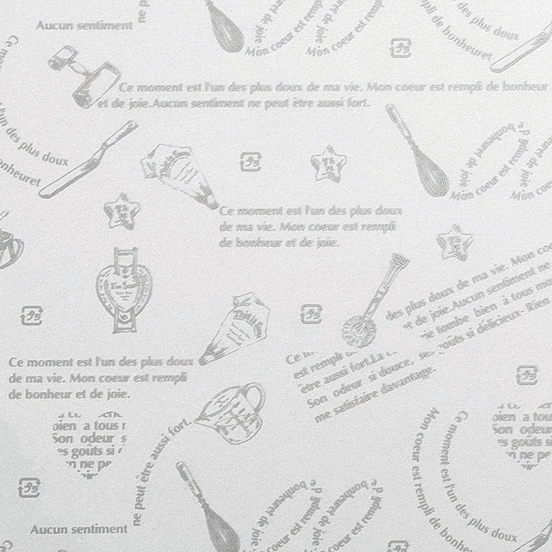 ココットシートとしては勿論、小ぶりなケーキの全包装や色々なラッピングに使えるシートです。使いやすく、お洒落なフランス語柄のデザイン。