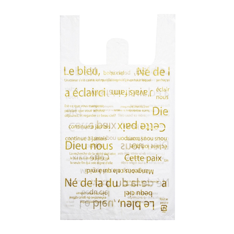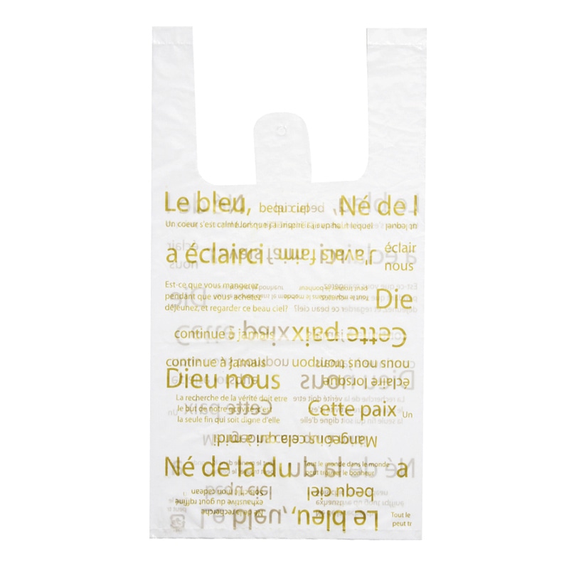 乳白カラーでゴールドの文字カラーがプリントされたレジバッグです。サイズ展開が豊富ですのでいろいろな場でご利用いただけます。●入数:100枚