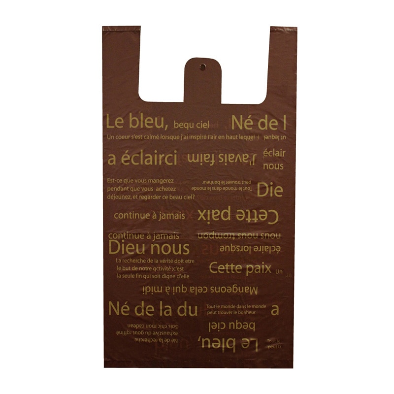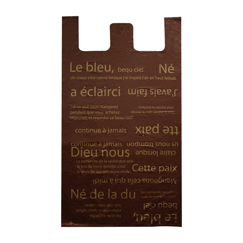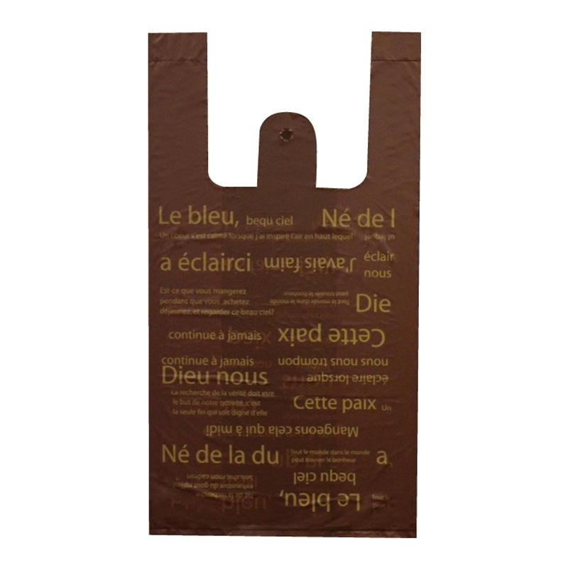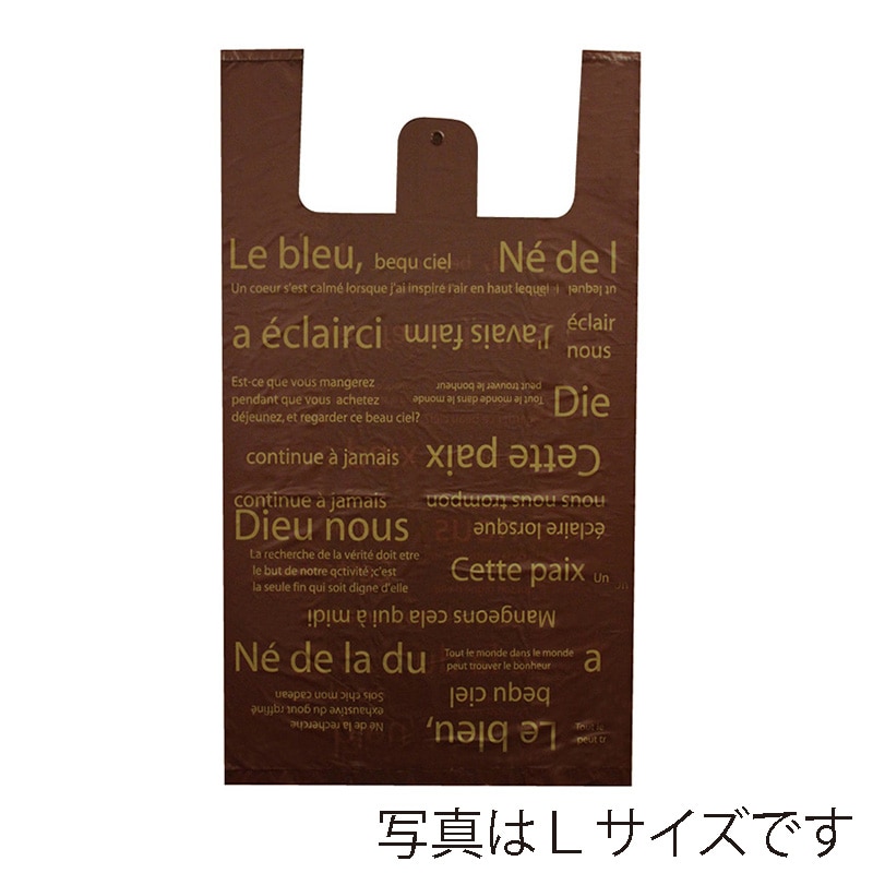 ブラウンカラーでゴールドの文字カラーがプリントされたレジバッグです。サイズ展開が豊富ですのでいろいろな場でご利用いただけます。●入数:100枚