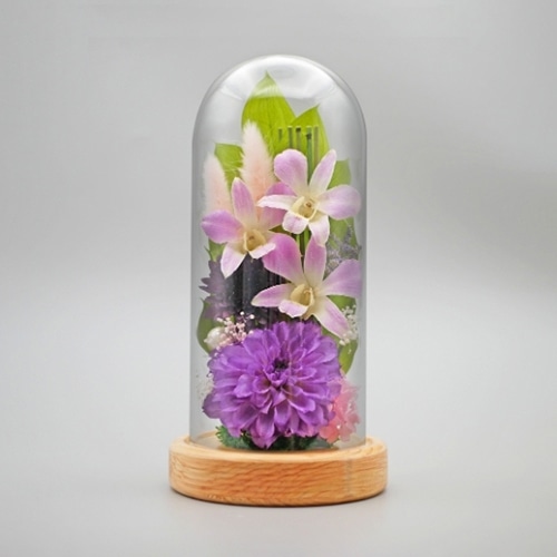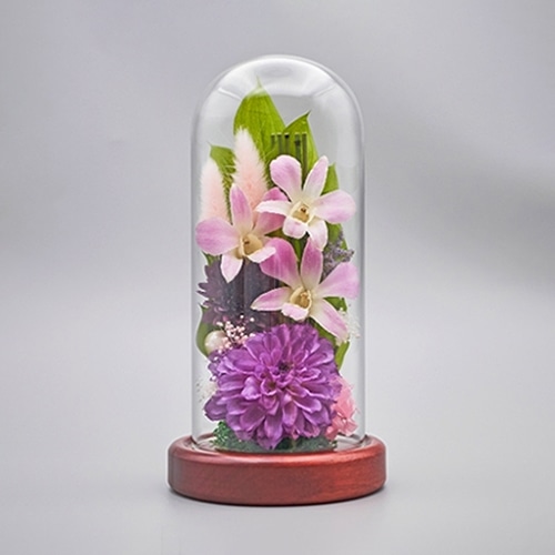 美しく繊細なデザインで、大切な方へのお供えにぴったりな「ボトルフラワー」。ガラスの中に厳選されたドライフラワーを丁寧にアレンジし、永く美しさを保ちます。全3色のカラーバリエーションからお選びいただけるので、贈る方やお部屋の雰囲気に合わせたコーディネートが可能です。生花とは異なり、水やり不要で手間がかからず、納骨堂やご自宅のお供え用としても人気です。●メインフラワー:洋蘭/シクラメン