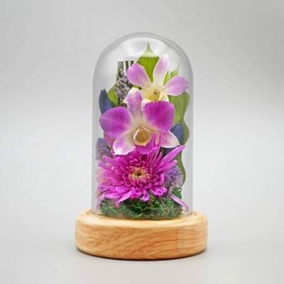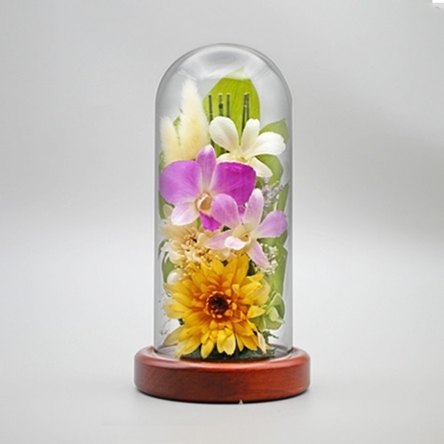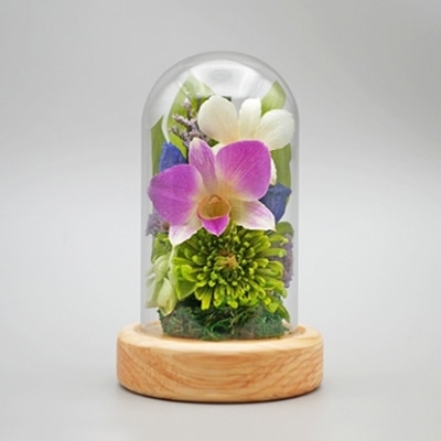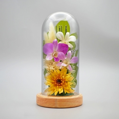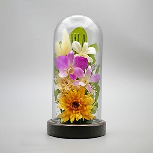 美しいガラスの土台が光を受けて輝き、インテリアとして特別な存在感を放つドライフラワーアレンジメントです。透明感あふれるガラスの中に丁寧に配置されたドライフラワーが、色褪せない華やかさを演出します。3色展開で、お好みに合わせて選べるのも魅力です。どの角度から見ても異なる表情を楽しめる360度鑑賞可能なデザインは、大切な方へのギフトやご自身の癒し空間にぴったりです。●メインフラワー:洋蘭/マム/バラ