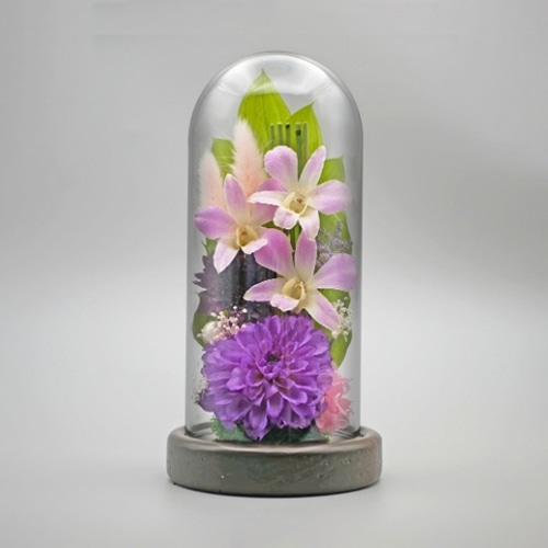 美しいガラスの土台が光を受けて輝き、インテリアとして特別な存在感を放つドライフラワーアレンジメントです。透明感あふれるガラスの中に丁寧に配置されたドライフラワーが、色褪せない華やかさを演出します。3色展開で、お好みに合わせて選べるのも魅力です。どの角度から見ても異なる表情を楽しめる360度鑑賞可能なデザインは、大切な方へのギフトやご自身の癒し空間にぴったりです。●メインフラワー:洋蘭/ダリア/マム