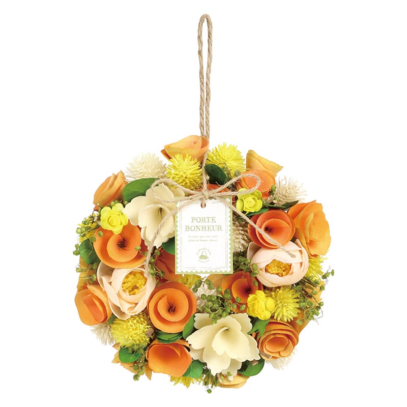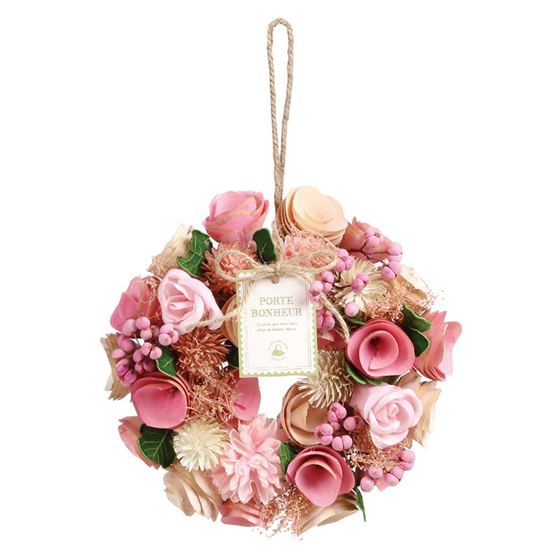 お家やお部屋にアクセントとして、空間に彩を加えるインテリアとして活躍するリースです。ベース部分は発泡スチロールで商品の裏側に麻紐が付いており、お好みの長さに調整いただきそのまま引っ掛けて飾っていただけます。