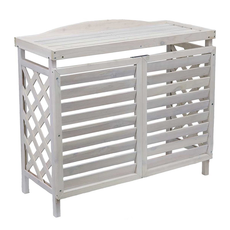 生活感が出てしまうエアコン室外機に目隠しをするおしゃれな室外機カバーです。センスのいいお庭にイメージチェンジできるだけでなく、上にプランターなどが置けるので、デッドスペースの有効活用にもなります。植物にやさしい上向きルーバー仕様で、排気を上部へ逃がします。室外機の前に置けなかった植物などを置けるようになるので、ガーデニングスペースが広がります。ガーデニングの作業台として、洗濯カゴの一時置きにも便利です。5枚のパーツをネジで止めていくだけで簡単に組み立てられ、室外機にかぶせるだけで簡単に設置できます。約5.8kgと軽く、移動もしやすいです。※室外機カバーは有効内寸が大変重要です。室外機のでっぱりも含めたサイズを計測し、ご自宅の室外機のサイズに合うかどうか、ご確認ください。●有効内寸:幅870×奥行340×高さ750mm●重量:約5.8kg●仕上げ:ステイン塗装●組み立て式●組立目安時間:2人で20分
