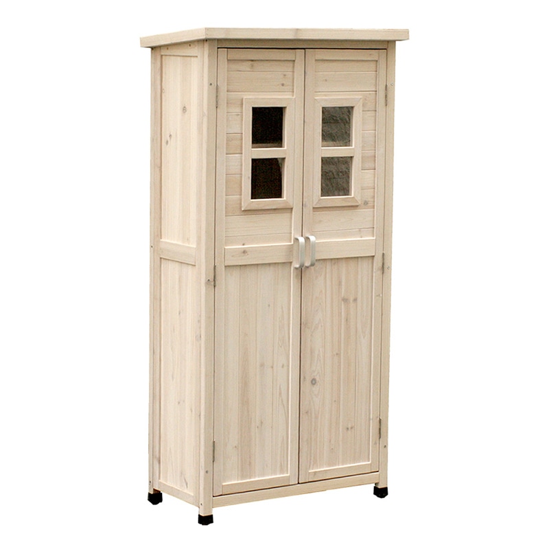 ベランダやバルコニーなど、せまい場所にも違和感なく馴染む、ナチュラルな天然木製の薄型収納庫です。ガーデニング用品や、お掃除グッズなどの収納におすすめです。棚板は前後二枚分割方式なので、前を外せば高さのあるものも収納できます。棚板2枚組×3セット付属。扉は上下マグネット式。脚部アジャスター付き。※屋根は完全防水ではありません。●収納有効内寸:幅約660×奥行290×高さ1400mm●棚板サイズ:幅約682mm×奥行128mm●重量:約26kg●仕上げ:ステイン塗装●組み立て式