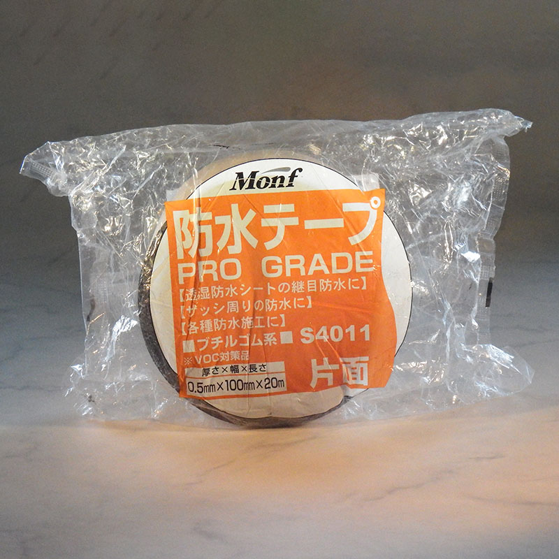 ポリエチレンネット基材にブチルゴム系の粘着剤を片面に塗布した、防水性・気密性に優れた防水機密テープです。断熱材・気質ボード・透湿シートの繋ぎ目や、サッシ周りの防水に適しています。1巻ピロー包装。