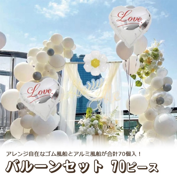 パーティー会場を盛り上げるバルーンセットです。アレンジ自在なゴム風船とアルミ風船が合計70個入り。壁に貼り付けたり、ヘリウムガスを入れて浮かべたりとアイデア次第で素敵な空間を演出できます。誕生日パーティーや結婚式・披露宴に最適です。バルーンガーランドを作るのに便利なアレンジ用テープやドット型の両面テープも付属しています。アレンジ用テープは、大きい穴と小さい穴が1セットで空いている透明なテープです。風船を繋ぎ合わせてガーランドを作る際に使用します。ドット型の両面テープは、直径1cmほどの透明な両面テープで膨らませた風船に貼り付け、風船同士をくっつけます。ガーランドを作ってから、風船の向きを固定できます。※ご自身で空気またはヘリウムガスを入れて膨らませていただく商品です。【セット内容】25cmビニール風船クリア×5個/25cm風船グレー×20個/25cm風船ホワイト×42個/35cmビニール風船フラワー×1個/45cmアルミ風船シルバーハート型×2個/アレンジ用テープ×1個/ドット型両面テープ×1個