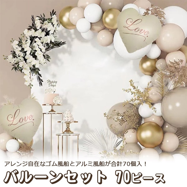 パーティー会場を盛り上げるバルーンセットです。アレンジ自在なゴム風船とアルミ風船が合計70個入り。壁に貼り付けたり、ヘリウムガスを入れて浮かべたりとアイデア次第で素敵な空間を演出できます。誕生日パーティーや結婚式・披露宴に最適です。バルーンガーランドを作るのに便利なアレンジ用テープやドット型の両面テープも付属しています。アレンジ用テープは、大きい穴と小さい穴が1セットで空いている透明なテープです。風船を繋ぎ合わせてガーランドを作る際に使用します。ドット型の両面テープは、直径1cmほどの透明な両面テープで膨らませた風船に貼り付け、風船同士をくっつけます。ガーランドを作ってから、風船の向きを固定できます。※ご自身で空気またはヘリウムガスを入れて膨らませていただく商品です。【セット内容】25cm風船ベージュ×18個/25cm風船ゴールド×10個/25cm風船ピンクベージュ×10個/25cm風船ライトベージュ×30個/45cmアルミ風船ベージュハート型×2個/アレンジ用テープ×1個/ドット型両面テープ×1個