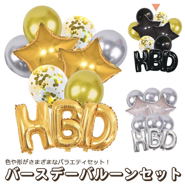 バースデーパーティー会場を盛り上げるバルーンセットです。壁に貼り付けたり、リボンで吊ったりとアイデア次第で素敵な空間を演出できます。サイズ・カラー・形の異なるバルーンが11個入っています。風船を浮かべる際に便利なリボンテープと、長さ10cmのストローが付属しています。紙吹雪の入ったコンフェッティバルーンは、膨らませてから乾いたタオルでバルーンの表面を優しくこすると、下に溜まっていた紙吹雪が静電気で風船全体にまとわりつくようになります。※ご自身で空気またはヘリウムガスを入れて膨らませていただく商品です。【セット内容】25cm風船ゴールド×2個/25cm風船ブラック×2個/40cmアルミ風船ブラック星型×2個/25cmコンフェッティ(紙吹雪)風船×2個/40cmHBDアルミ風船×1個/リボンテープ×1個/ストロー×1個