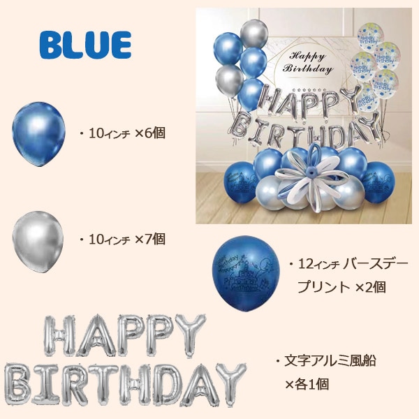 バースデーパーティー会場を盛り上げるバラエティ豊かなバルーンセットです。壁に貼り付けたり、ヘリウムガスを入れて浮かべたりとアイデア次第で素敵な空間を演出できます。バルーンガーランドを作るのに便利なアレンジ用テープやドット型の両面テープ、ストローも付属しています。※ご自身で空気またはヘリウムガスを入れて膨らませていただく商品です。ポンプは付属しません。【セット内容】「HAPPY BIRTHDAY」文字アルミ風船シルバー各1個/12インチバースデープリント風船クリア×5個/12インチバースデープリント風船ブルー×2個/10インチアルミ風船ブルー×6個/10インチアルミ風船シルバー×7個/ロングバルーン×6個/「HAPPY BIRTHDAY」ポスター×1枚/アレンジ用テープ×1個/ドット型両面テープ×1個/リボンテープ×1個/ストロー×1個