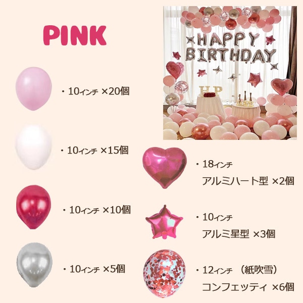 バースデーパーティー会場を盛り上げるバルーンセットです。アレンジ自在なゴム風船とアルミ風船等が合計60個以上入っています。壁に貼り付けたり、ヘリウムガスを入れて浮かべたりとアイデア次第で素敵な空間を演出できます。バルーンガーランドを作るのに便利なアレンジ用テープや、ドット型の両面テープも付属しています。風船結びツールは膨らませた風船の口を縛るのに便利で、指にはめて簡単に口が結べ、手が痛くなりません。※ご自身で空気またはヘリウムガスを入れて膨らませていただく商品です。ポンプやストローは付属しません。【セット内容】「HAPPY BIRTHDAY」文字アルミ風船各1個/10インチ風船ピンク×20個/10インチ風船ホワイト×15個/10インチアルミ風船ピンク×10個/10インチアルミ風船ホワイト×5個/18インチアルミ風船ハート型×2個/10インチアルミ風船ダイヤ型×4個/10インチアルミ風船ピンク星型×3個/12インチ紙吹雪風船×6個/風船結びツール×1個/アレンジ用テープ×1個/ドット型両面テープ×1個