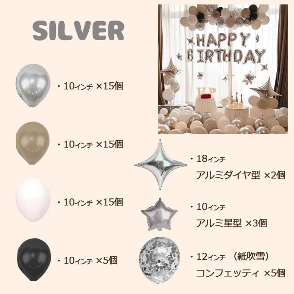 バースデーパーティー会場を盛り上げるバルーンセットです。アレンジ自在なゴム風船とアルミ風船等が合計60個以上入っています。壁に貼り付けたり、ヘリウムガスを入れて浮かべたりとアイデア次第で素敵な空間を演出できます。バルーンガーランドを作るのに便利なアレンジ用テープや、ドット型の両面テープも付属しています。風船結びツールは膨らませた風船の口を縛るのに便利で、指にはめて簡単に口が結べ、手が痛くなりません。※ご自身で空気またはヘリウムガスを入れて膨らませていただく商品です。ポンプやストローは付属しません。【セット内容】「HAPPY BIRTHDAY」文字アルミ風船各1個/10インチ風船アルミシルバー×15個/10インチアルミ風船ゴールド×15個/10インチ風船ホワイト×10個/10インチ風船ブラック×5個/18インチアルミ風船ダイヤ型×2個/10インチアルミ風船ダイヤ型×4個/10インチアルミ風船シルバー星型×3個/12インチ紙吹雪風船×5個/風船結びツール×1個/アレンジ用テープ×1個/ドット型両面テープ×1個
