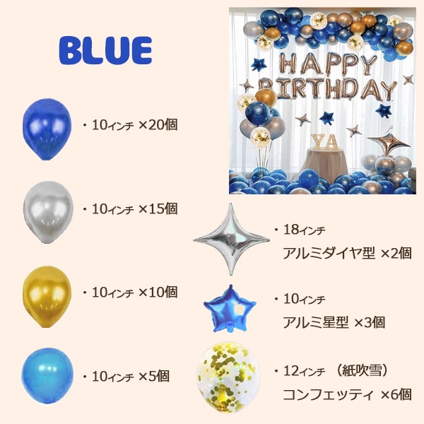バースデーパーティー会場を盛り上げるバルーンセットです。アレンジ自在なゴム風船とアルミ風船等が合計60個以上入っています。壁に貼り付けたり、ヘリウムガスを入れて浮かべたりとアイデア次第で素敵な空間を演出できます。バルーンガーランドを作るのに便利なアレンジ用テープや、ドット型の両面テープも付属しています。風船結びツールは膨らませた風船の口を縛るのに便利で、指にはめて簡単に口が結べ、手が痛くなりません。※ご自身で空気またはヘリウムガスを入れて膨らませていただく商品です。ポンプやストローは付属しません。【セット内容】「HAPPY BIRTHDAY」文字アルミ風船各1個/10インチ風船ブルー×20個/10インチアルミ風船ホワイト×15個/10インチアルミ風船ゴールド×10個/10インチアルミ風船ブルー×5個/18インチアルミ風船ダイヤ型×2個/10インチアルミ風船ダイヤ型×4個/10インチアルミ風船ブルー星型×3個/12インチ紙吹雪風船×6個/風船結びツール×1個/アレンジ用テープ×1個/ドット型両面テープ×1個