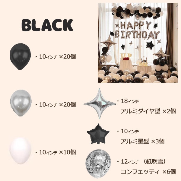 バースデーパーティー会場を盛り上げるバルーンセットです。アレンジ自在なゴム風船とアルミ風船等が合計60個以上入っています。壁に貼り付けたり、ヘリウムガスを入れて浮かべたりとアイデア次第で素敵な空間を演出できます。バルーンガーランドを作るのに便利なアレンジ用テープや、ドット型の両面テープも付属しています。風船結びツールは膨らませた風船の口を縛るのに便利で、指にはめて簡単に口が結べ、手が痛くなりません。※ご自身で空気またはヘリウムガスを入れて膨らませていただく商品です。ポンプやストローは付属しません。【セット内容】「HAPPY BIRTHDAY」文字アルミ風船各1個/10インチ風船ゴールド×20個/10インチ風船ブラック×20個/10インチ風船シルバー×10個/18インチアルミ風船ダイヤ型×2個/10インチアルミ風船ダイヤ型×4個/10インチアルミ風船ブラック星型×3個/12インチ紙吹雪風船×6個/風船結びツール×1個/アレンジ用テープ×1個/ドット型両面テープ×1個