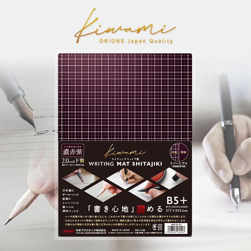 書き心地抜群のライティングマット下敷です。B5サイズ用紙より少し大きめのサイズであるため紙の角端が下敷からはみ出ることなく、折れたりしわになったりするのを防ぎます。表面は方眼タイプ、裏面は無地タイプでリバーシブル仕様です。紙に対して滑り止め効果のある特殊加工のPVC再生マット生地を使用しています。万年筆やガラスペン等の筆記具にも効果を発揮し、押印マットやマウスパッド等にも使用可能です。