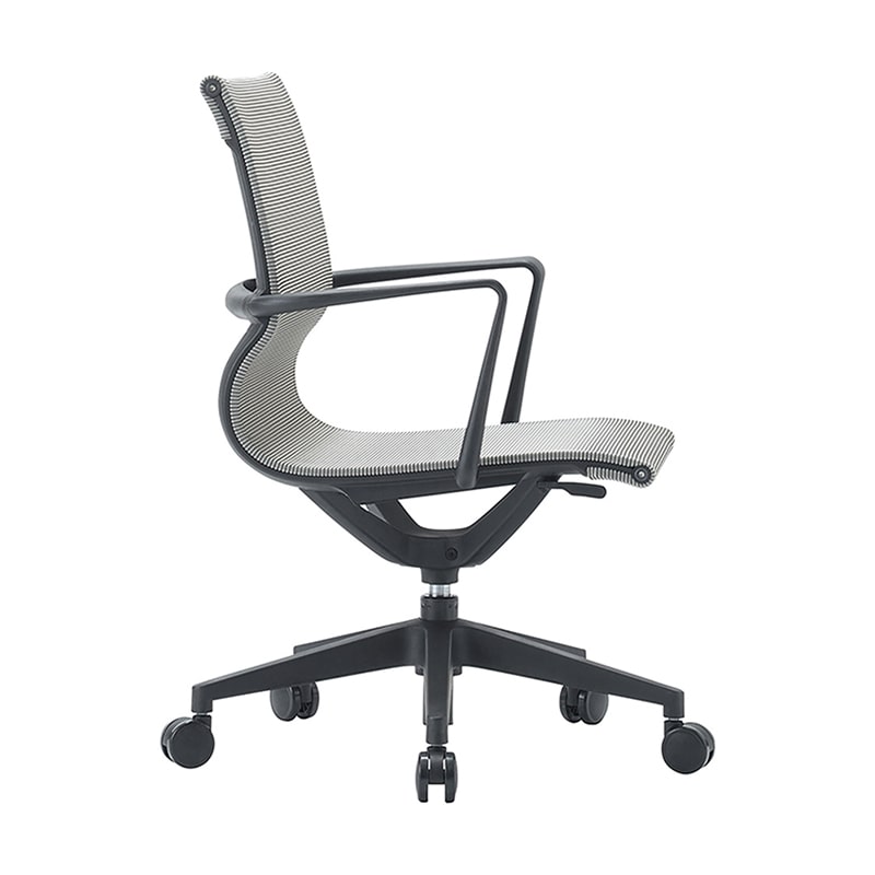 開放的な空間コーデにもふさわしいスタイリッシュなフルメッシュ仕様。シンプルなデザインを実現した目立たないワイヤー式の調整機構を採用。デザイン性にこだわった新しいタイプのエグゼクティブ兼ミーティングチェア。特徴的なアールデザイン。強化ナイロン樹脂成形脚、φ60㎜ウレタン双輪キャスター装備。●ローバックタイプ●上部全体ロッキング機構●ガス上下調整●固定肘掛け付き●グリーン購入法適合●再生樹脂