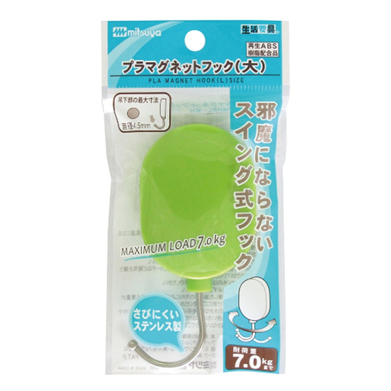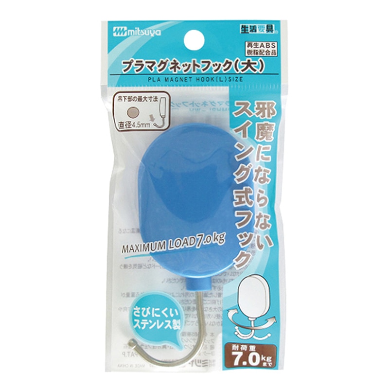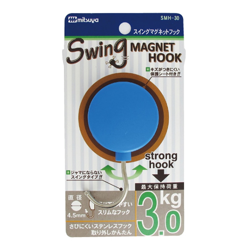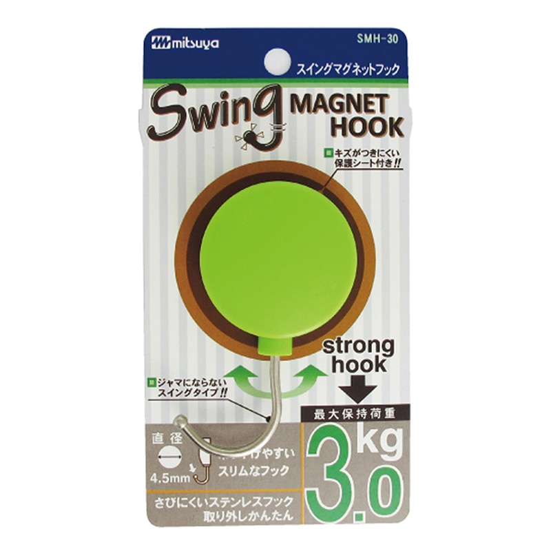 耐荷重約3kgのマグネットフック。フック部分が左右にスイング、収納できるので未使用時邪魔になりません。磁着面に傷防止フィルム貼合しています。スライドパック(PET樹脂)入り。●入数:1個●色:橙