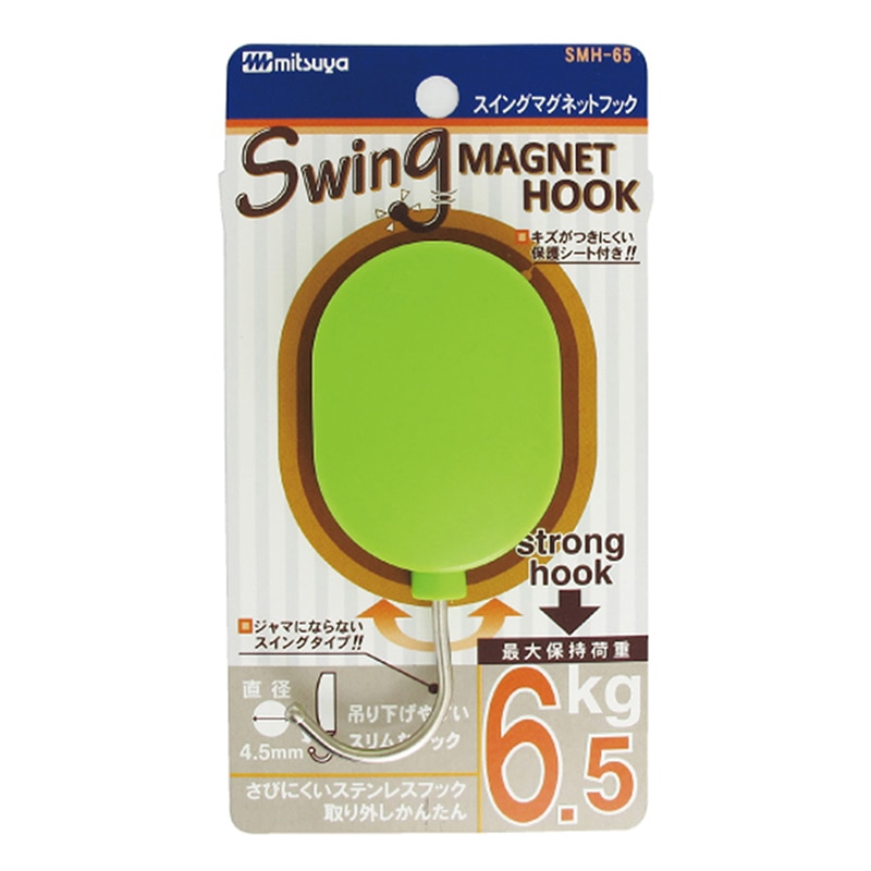 耐荷重約6.5kgのマグネットフック。フック部分が左右にスイング、収納できるので未使用時邪魔になりません。磁着面に傷防止フィルム貼合しています。スライドパック(PET樹脂)入り。●入数:1個●色:橙