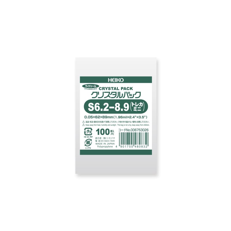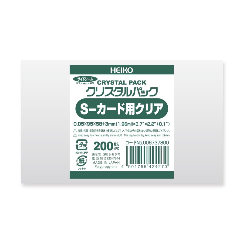 つやがあり、透明感抜群の国産高級OPPフィルムを使用したクリスタルパックシリーズ。すべりが良く作業効率もバツグン。袋の両側を熱圧着して製造する為、のりしろが発生しないので中身が綺麗に見えます。S(サイドシール)はテープが付いていない、最もスタンダードなシリーズです。口に段差を付けていますので、開き易くなっています。片面が白になっているため、カードのデザインが映えます。食品衛生法規格基準適合商品です。●入数:200枚