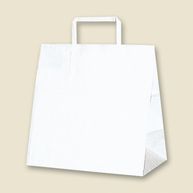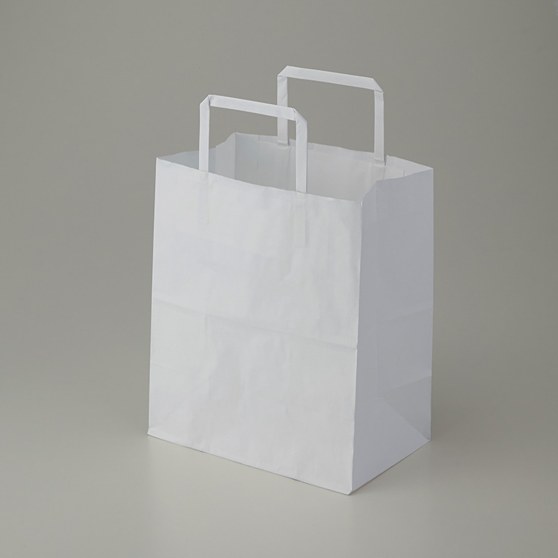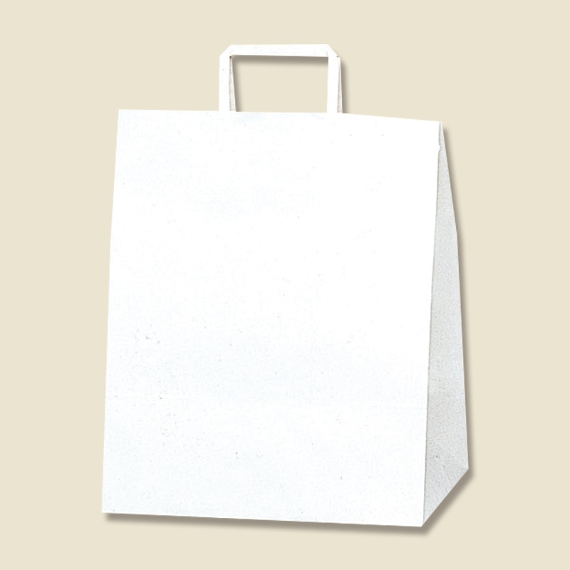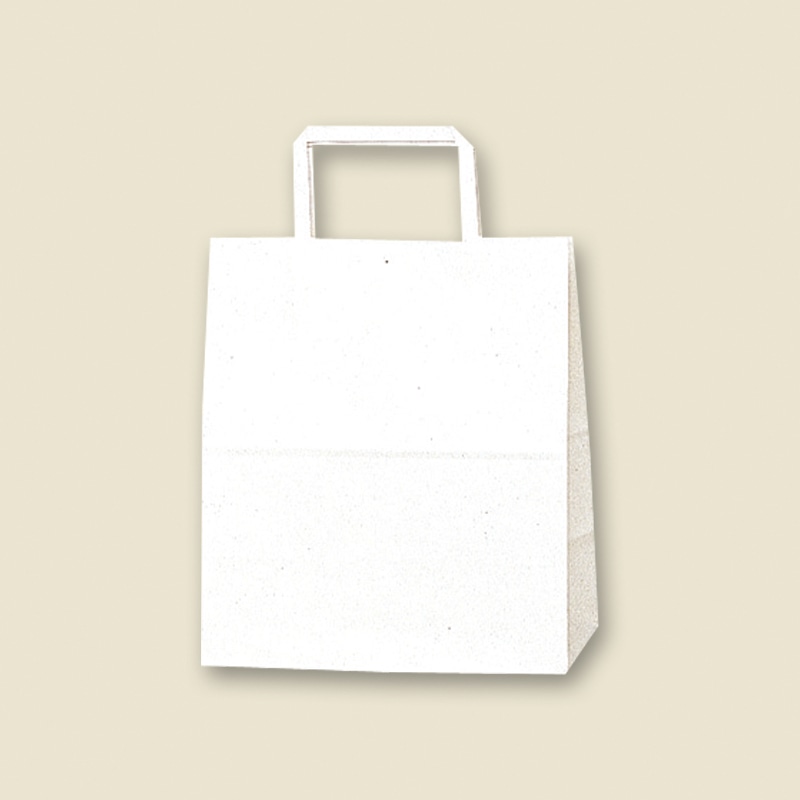 もっとも汎用性の高い、プレーンな白無地の手提げ袋です。食パン2斤を入れるのにおすすめサイズです。表面に艶のない、晒クラフト紙を使用しております。未使用時には紐が飛び出ていないため、在庫スペースにやさしい平紐タイプです。●手紐:平紐白●入数:50枚