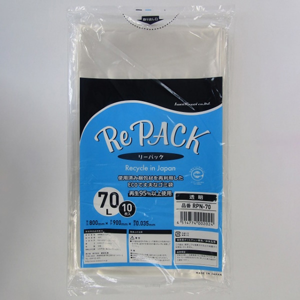 岩井化成 再生ごみ袋 リーパック 透明 70L 10枚入 RPN-70 10枚/袋(ご注文単位30袋)【直送品】