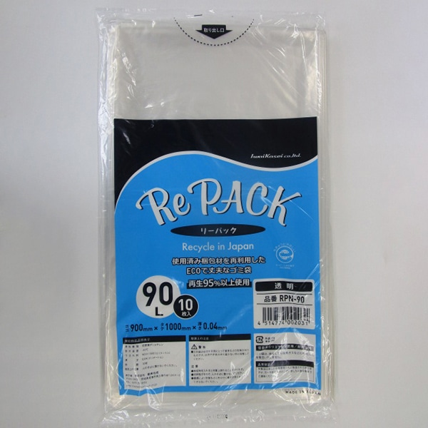 岩井化成 再生ごみ袋 リーパック 透明 90L 10枚入 RPN-90 10枚/袋(ご注文単位20袋)【直送品】