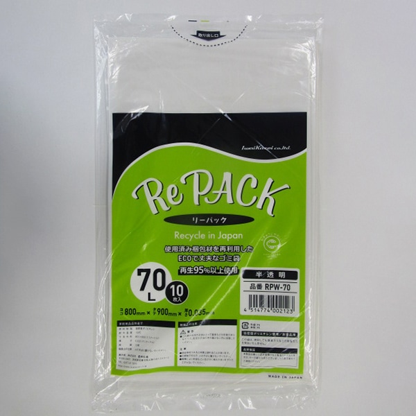 岩井化成 再生ごみ袋 リーパック 半透明 70L 10枚入 RPW-70 10枚/袋(ご注文単位30袋)【直送品】