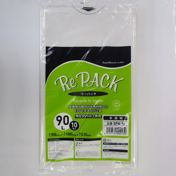 岩井化成 再生ごみ袋 リーパック 半透明 90L 10枚入 RPW-90 10枚/袋(ご注文単位20袋)【直送品】