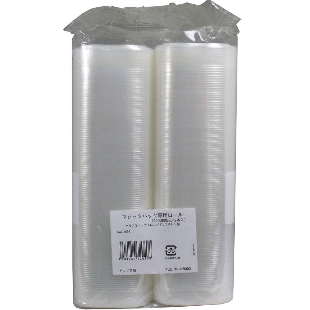 ●ご家庭で手軽にワンタッチ操作で簡単に真空パックできる真空パック器マジックバックアリスV952用の専用ロール袋です。マジックバックアリスV952で脱気することにより、食品の保存期間を大幅にのばすことができます。いつでも新鮮で安全な食材を気軽に保存するのに、マジックバックは最適です。・安全に安心して保存できる優れた真空パック用のロール袋です。・空気を遮断することにより、食品の酸化、カビの発生、腐敗を最小限におさえる事ができニオイ移りもありません。・食品以外の鉄製品、宝石類などを酸化変色から守ります。・そのまま直接お鍋に入れてゆでる事ができます。・電子レンジで加熱もできます。 ●【サイズ】 30X600cm 【素材】 ポリアミド・ナイロン、ポリエチレン 【個装サイズ】 135X310X55mm 【個装重量】 約720g 【内容量】 ロール2本(幅30X長さ600cm) 【製造国】:イタリア ●【ご注意】・真空パック器マジックバック専用袋として、マジックバックの取扱説明書をよくお読みの上、正しくお使いください。