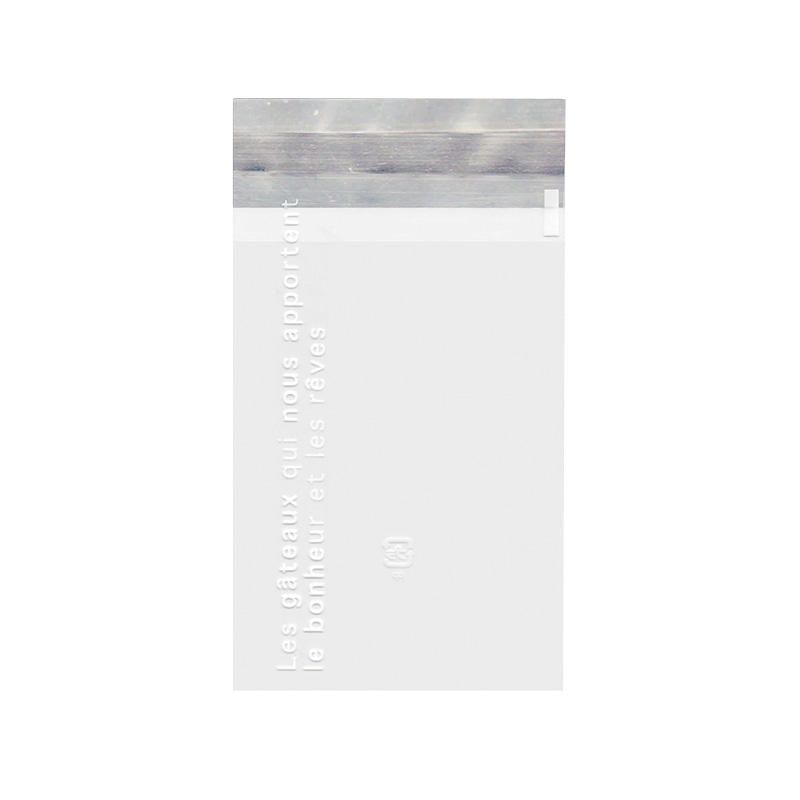 防曇加工したOPP袋です。口部分がフラップ付タイプで開けやすく、作業効率がアップします。お菓子・パンの個包装向けの商品で、フィナンシェなどに最適なサイズです。フラップ部分に口留めのシールは付いておりません。食品衛生法規格基準適合商品です。●入数:100枚