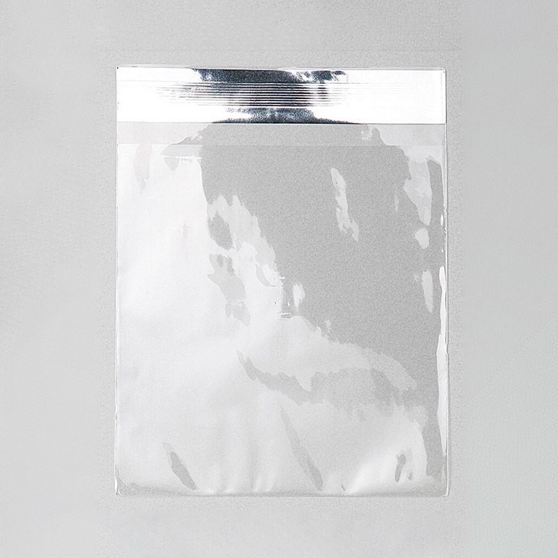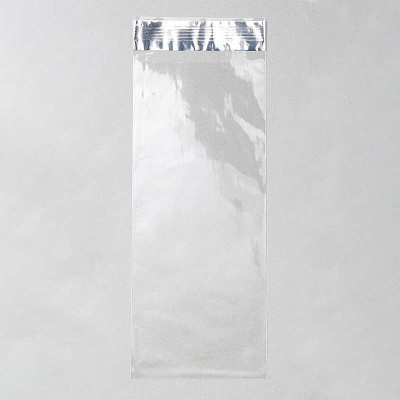 防曇加工したOPP袋です。テープ付きタイプで剥離紙が帯電防止のアルミ紙になっており、作業効率がアップします。お菓子・パンの個包装向けの商品で、フィナンシェなどに最適なサイズです。食品衛生法規格基準適合商品です。●入数:100枚