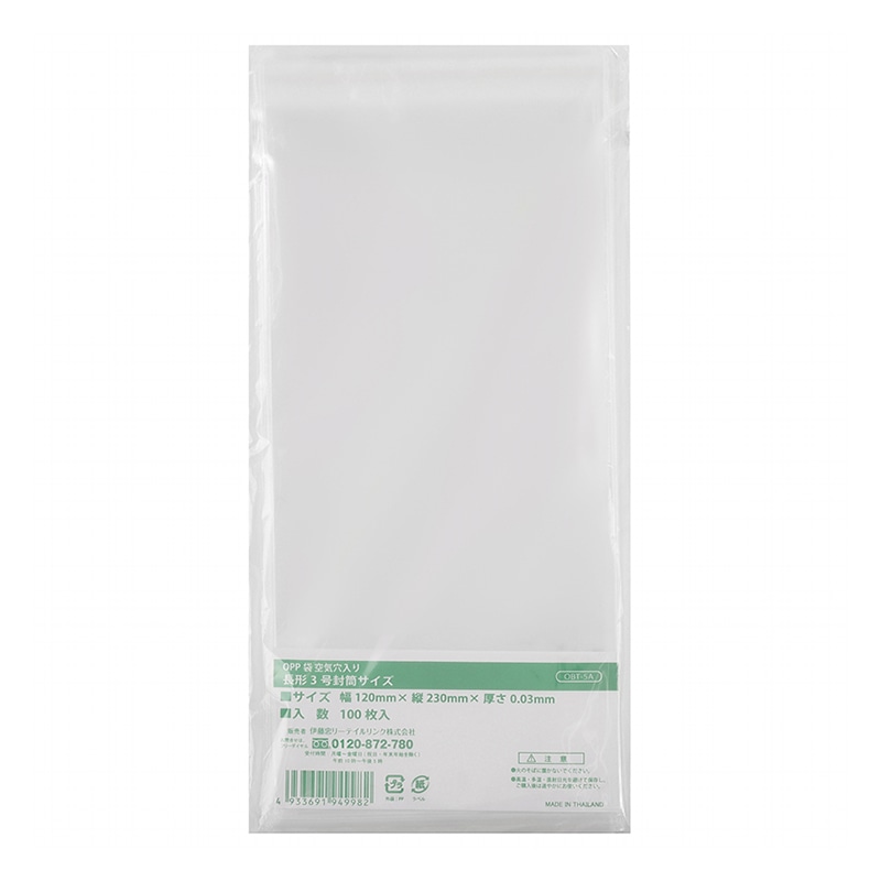 ●空気穴で袋内の空気を逃がし、破袋しにくい。●仕様/フタ・テープ付(アルミ蒸着)●サイズ/長3●寸法/タテ235×ヨコ120mm●厚さ/0.03mm●フタ/あり(高さ40mm)●のり/テープのり●材質/OPP●1パック=100枚●空気を逃がしやすいから、衣類などの保管に便利。空気穴付OPP袋、長3サイズ100枚入。
