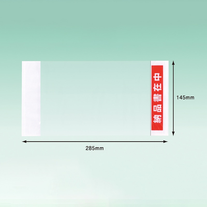 納品書・内容明細書を入れるプラスチックフィルム製の糊つき袋です。伝票等が荷物と同時到着で経費削減になります。プラスチックフィルム製で耐水性に優れています。部分セパレーターで作業が速く低コストです。封入口側に折り返しがついており、伝票の落下を防止する安心設計です。糊の幅は両サイドとも50mmです。