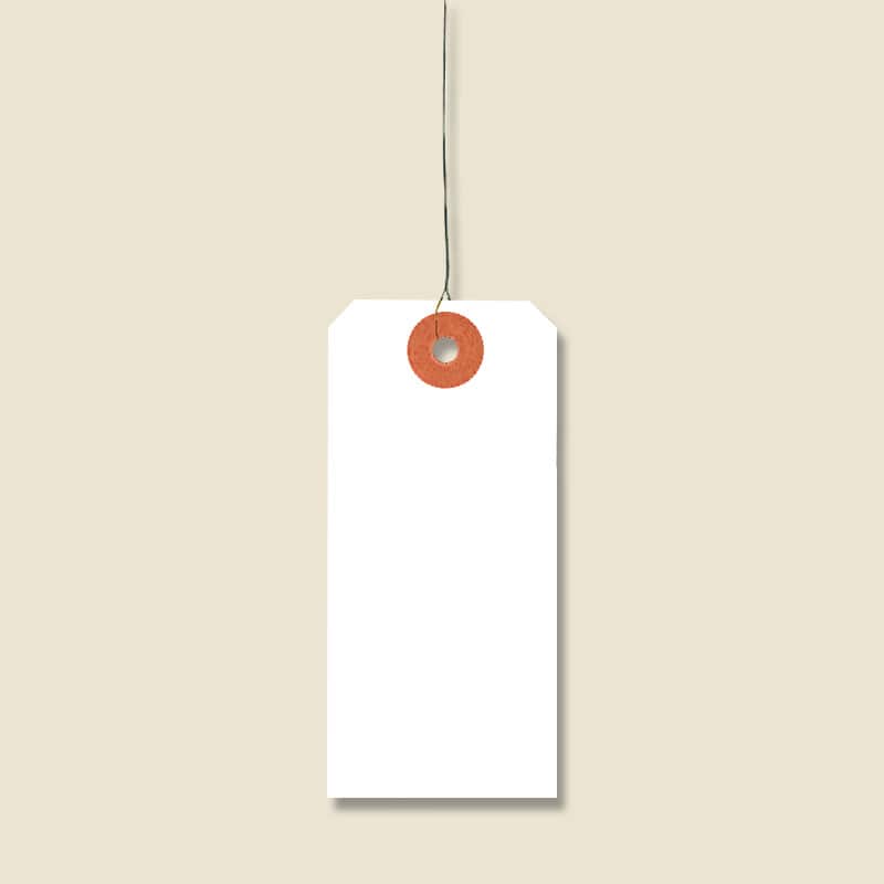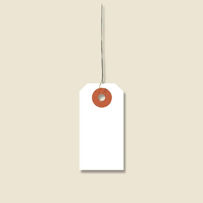 針金が付いた荷札です。一穴タイプで、サイズは縦90mm×横45mmの中サイズです。白無地で様々な内容を書き込むことができます。他のカラー荷札と合わせて使用することで荷物のグループ分けなどにも活用いただけます。針金部分を商品に括り付けて荷物の識別や表示タグ、値札として使用します。荷札では定番の上質紙。安価ですが耐水性はないので屋内使用向け。引っ張っても破れにくい紙ハトメ加工あり。2000枚箱入りの大容量の業務用タイプです。●針金付(約100mm)