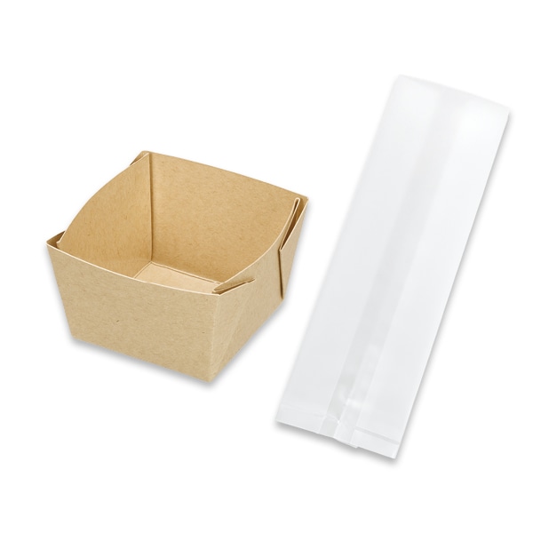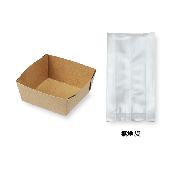 真果撰にセットできる商材です。そのまま焼成できるトレーにフィルムと袋がセット。内側PET貼で焼成可能。脱酸素材対応。袋はノッチ入りです。●入数:300セット