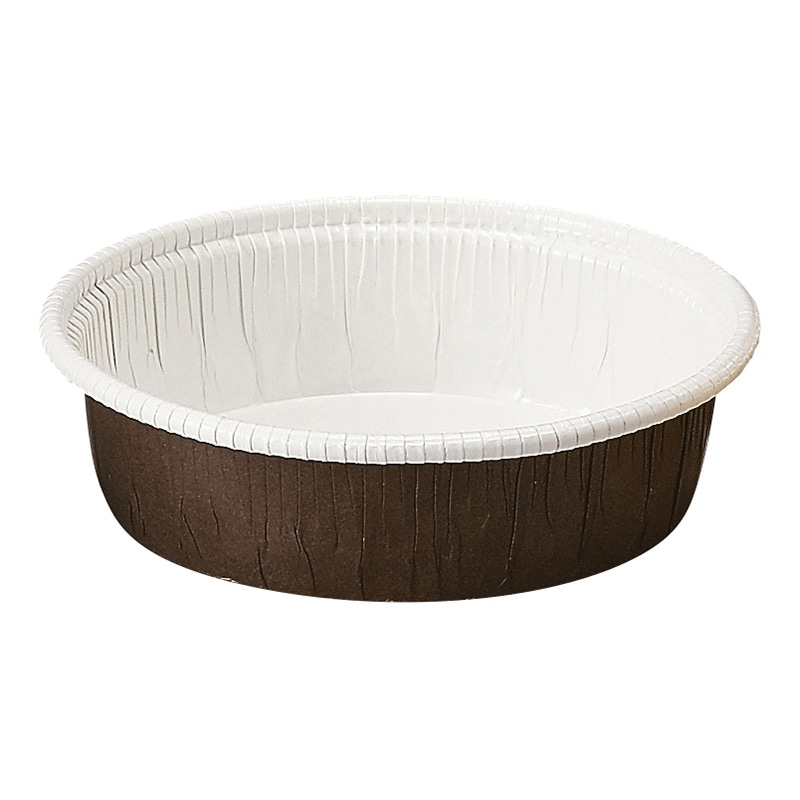 PETをラミネートした1枚の紙をプレス成型しており、水漏れがありません。焼き菓子やデザートはもちろん、惣菜など食品全般に幅広くお使いいただけます。オーブン使用可。容量:60cc。100枚入り。別売で専用蓋F-CR02があります。