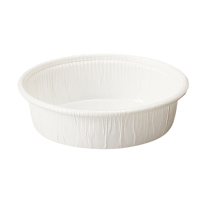 PETをラミネートした1枚の紙をプレス成型しており、水漏れがありません。焼き菓子やデザートはもちろん、惣菜など食品全般に幅広くお使いいただけます。オーブン使用可。容量:110cc。100枚入り。別売で専用蓋F-CR03があります。